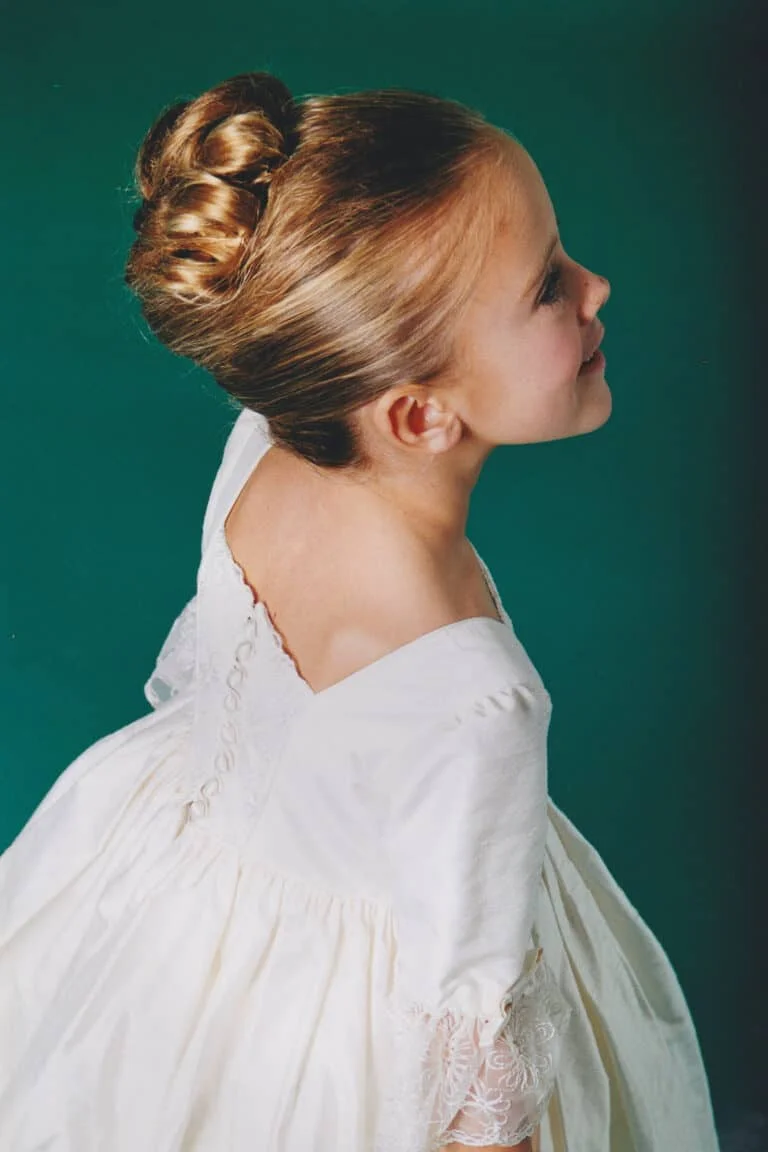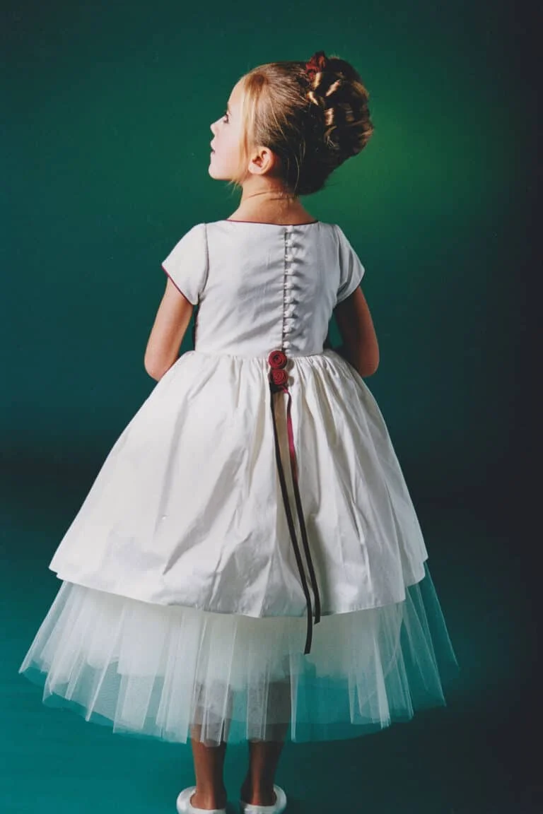 Wine red colour ballerina style flower girl dress.  Featuring embroidered silk top with matching satin detailing including piping, big bow, covered buttons and overskirt.